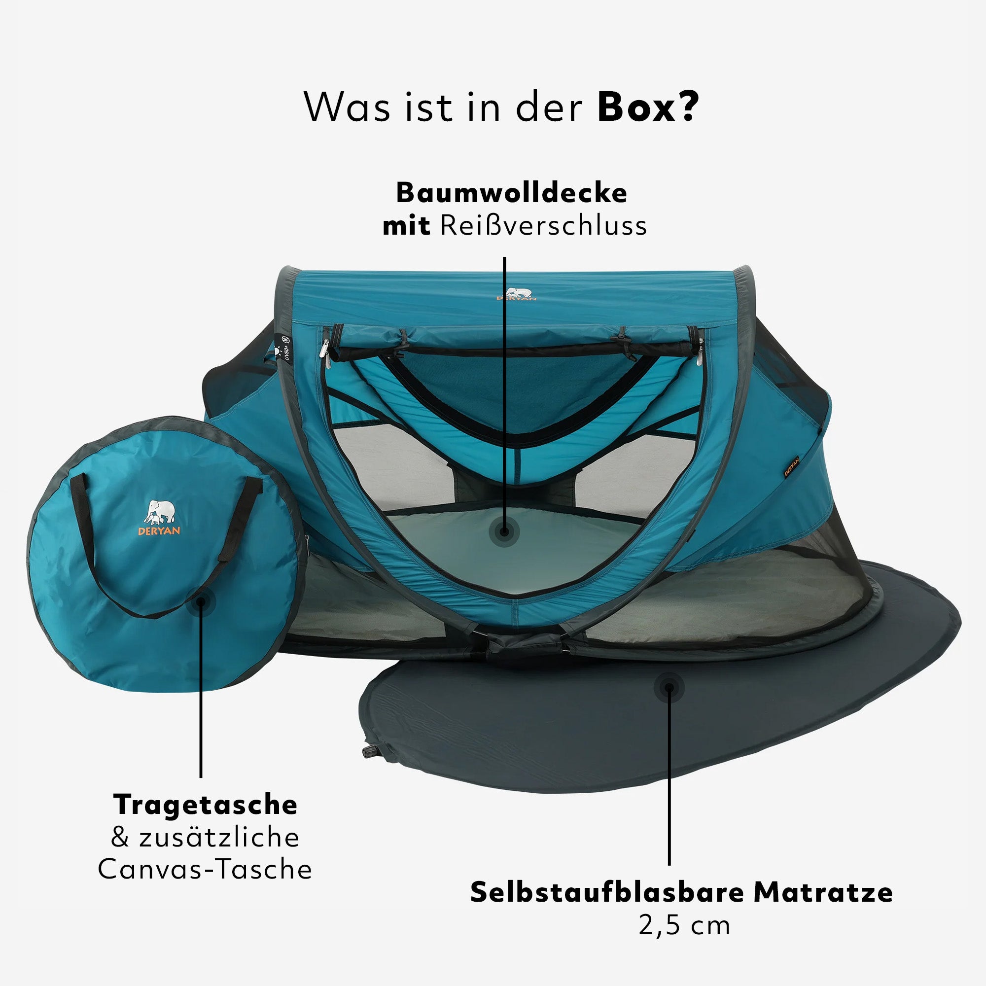 Der Peuter Luxe wird komplett geliefert: Peuter Luxe, Tragetasche, selbstaufblasende Matratze 3,5 cm, Baumwolldecke mit Reißverschluss, Bedienungsanleitung