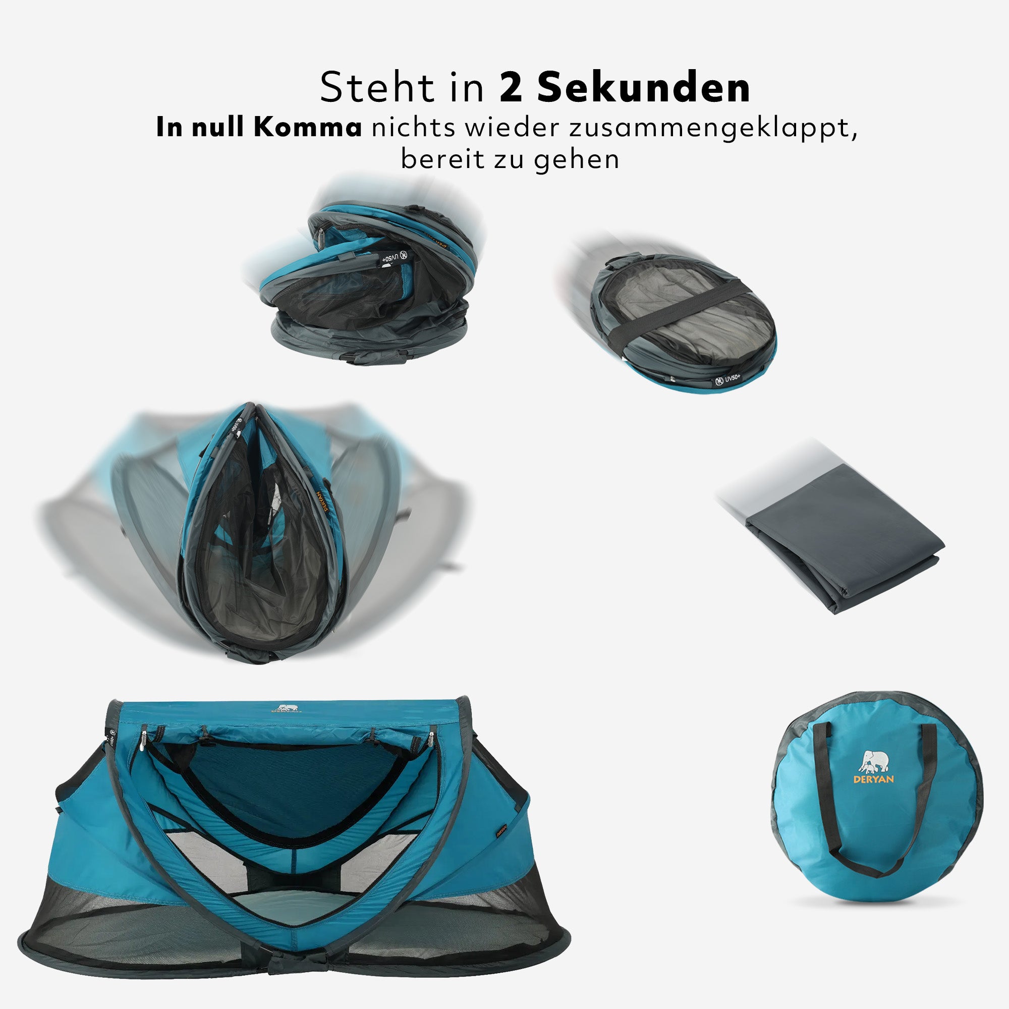 In nur 2 Sekunden steht die DERYAN Peuter Luxe! Das Zusammenfalten ist genauso einfach: Im Handumdrehen hast du die Peuter Luxe wieder zusammengefaltet und verstaut.